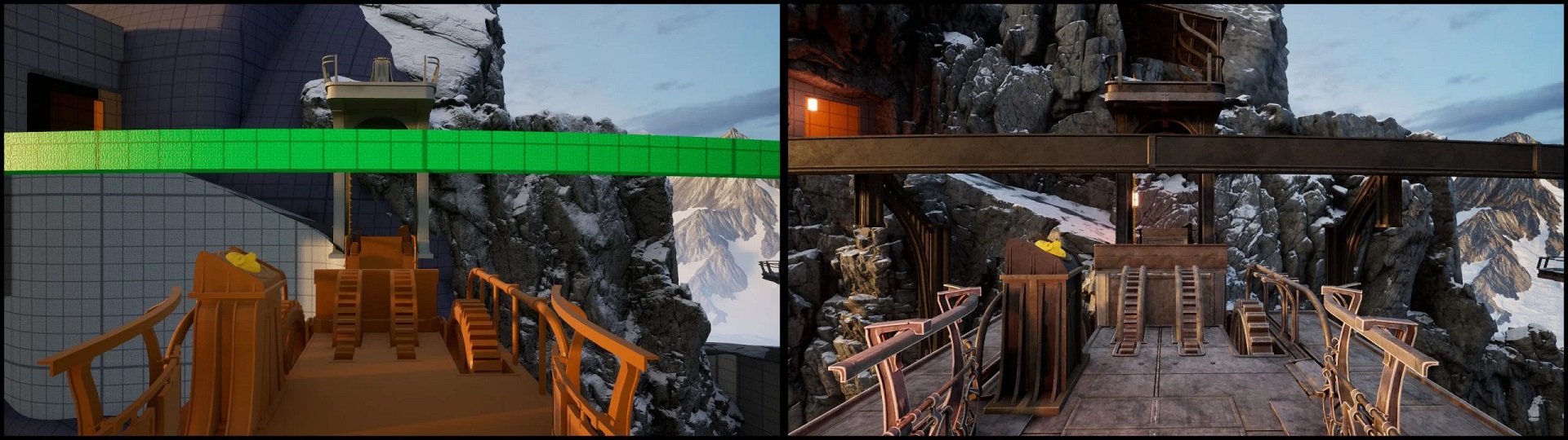 Bien que rien de ce que nous montrons aujourd'hui ne soit une "version finale", nous voulions vous donner un aperçu des coulisses du jeu tel que nous le voyons actuellement ! L'une des meilleures façons de voir le mouvement est de donner un contexte « avant et après ». Pour chacune des images (avant/apres), vous verrez des éléments "en blocs gris" d'architecture provisoire et ensuite le résultat une fois l'équipe artistique aura remplacé ces blocs par des objets que vous verrez dans le jeu.