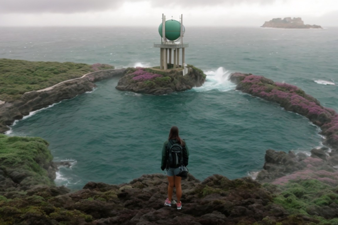 - petite île entourée d'eau avec la mer qui se déverse dans une cascade avec grande écume pour alimenter un petit lac calme au milieu de l'ile.