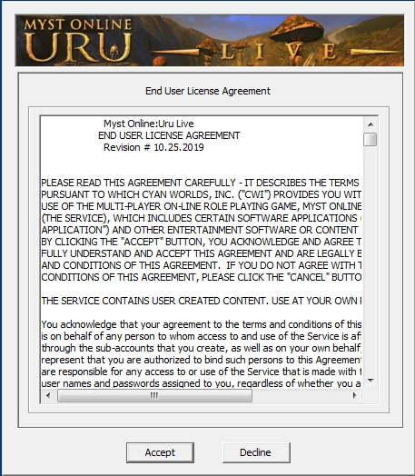 La raison pour laquelle vous voyez ce message est plutôt due au fait que vous essayez d'entrer dans un quartier de jeu actuellement trop plein. Cela arrive assez souvent ces derniers temps, et les développeurs de la communauté MOULa essaient de résoudre le problème. Il n'y a rien que Cyan puisse faire pour réparer les quartiers surpeuplés, malheureusement.