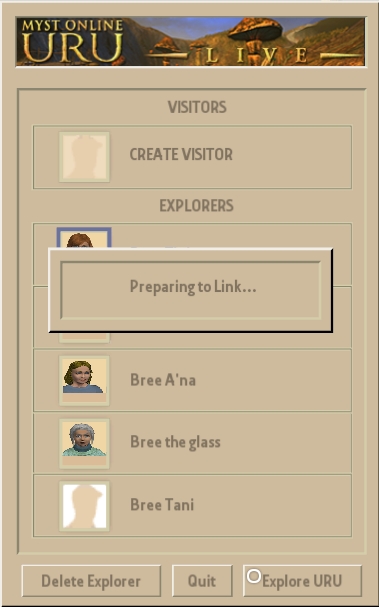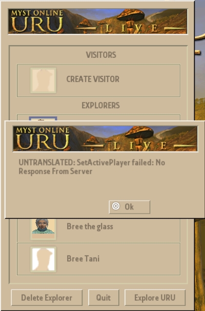 Parmis les plus récents il y en a qui sont devenus inaccessibles. Une fois sélectionné pour [Explore URU], un long temps s'écoule (Preparing to link...) et j'ai le message suivant : "There has been a Network error. Please try again. If problem persists, please contact support." [Ok] et c'est là le message le plus important : "UNTRANSLATED: SetActivePlayer failed: No Response From Server". [Ok] et je me retrouve brusquement hors du programme.